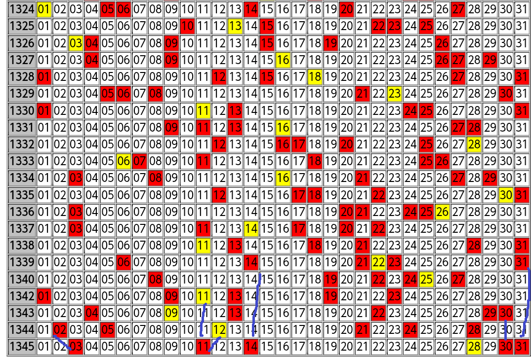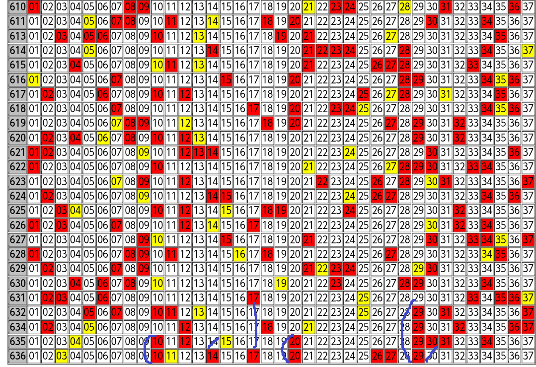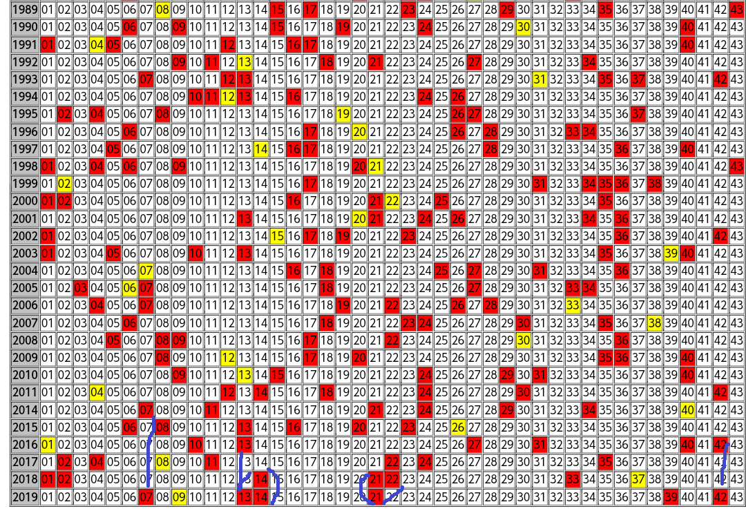 ロト6の出現傾向は色付きの出目表を見るとよく分かります。