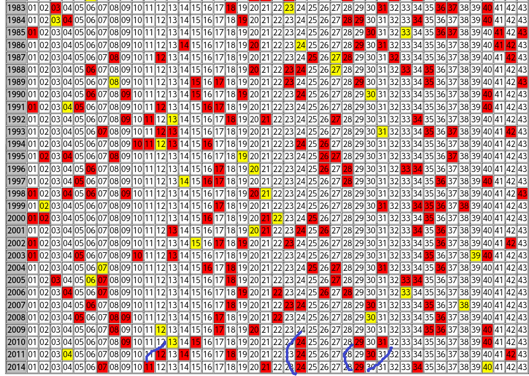 ロト6の出現傾向は色付きの出目表を見るとよく分かります。