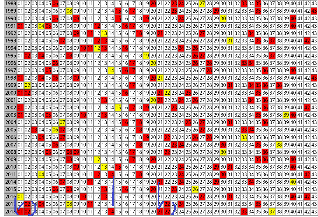 さて、2018回目のロト6の結果ですが、東京抽籤の出目表を見て、ちょっとだけ分析しておきます。