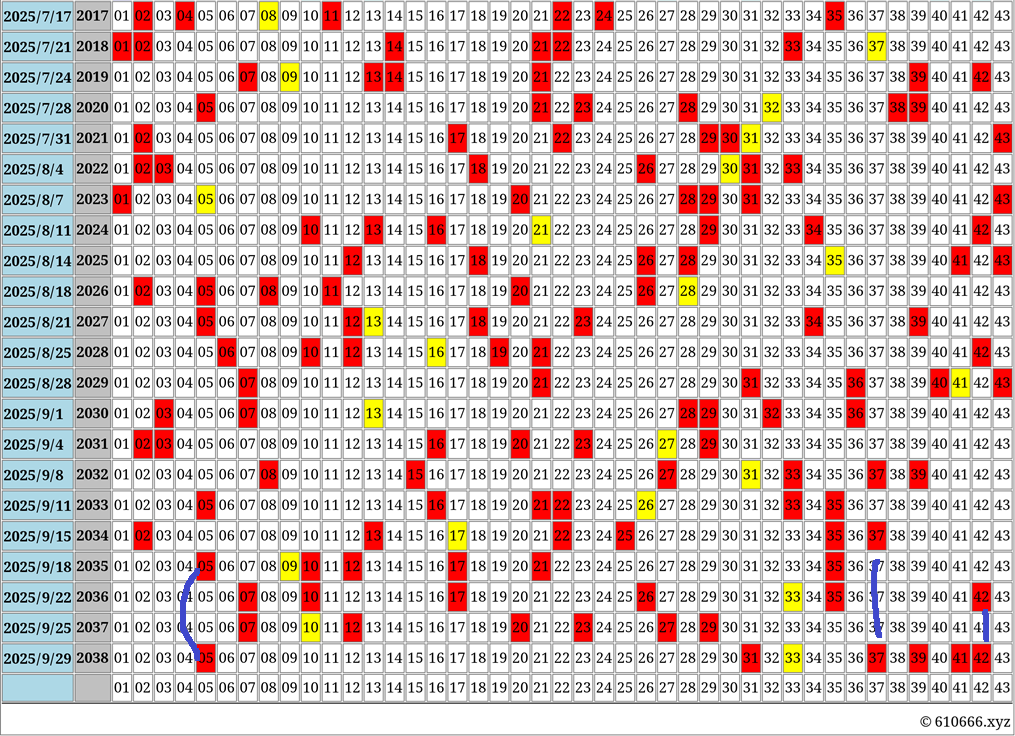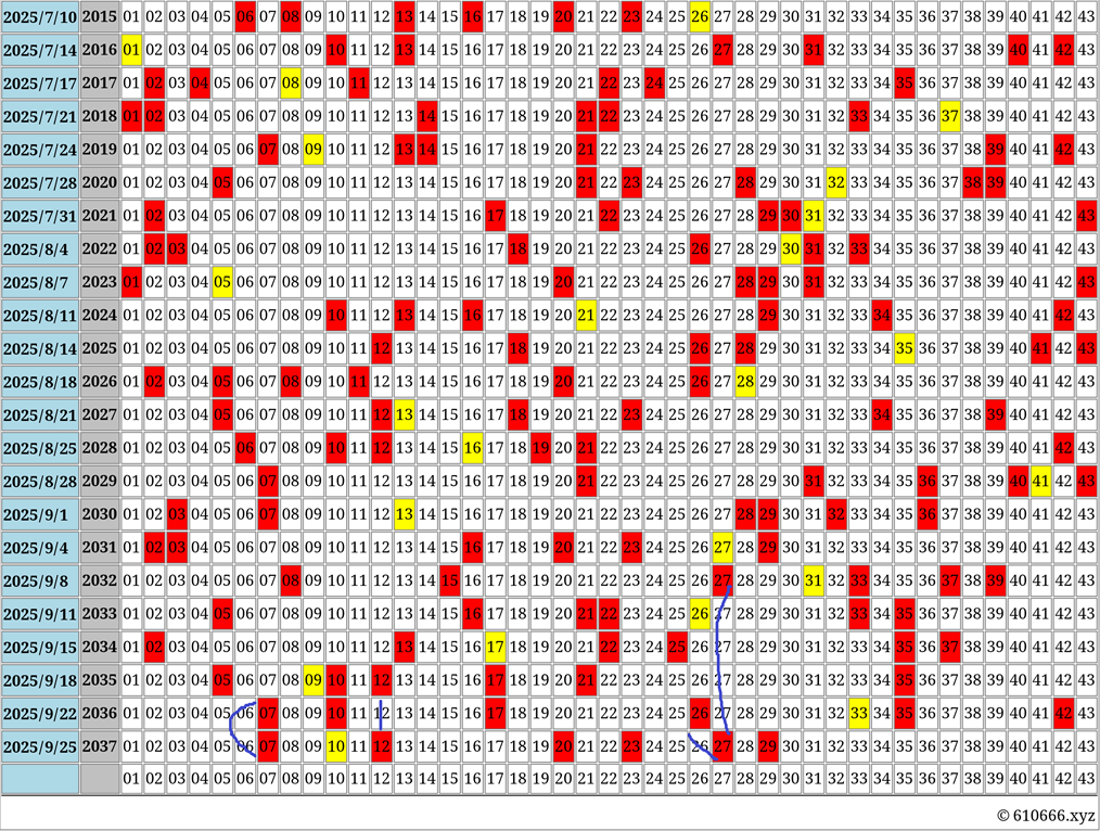 ※上記の画像は、「画像生成AIでの予想用ミニロトの出目表」で、「対象にする抽籤回数:直近50回」「対象にする抽籤会場:東京のみ」「抽籤日・抽籤回の表示:あり」「セル内の数字の表示:あり」に設定してダウンロードした画像をペイントソフトで編集したものです。