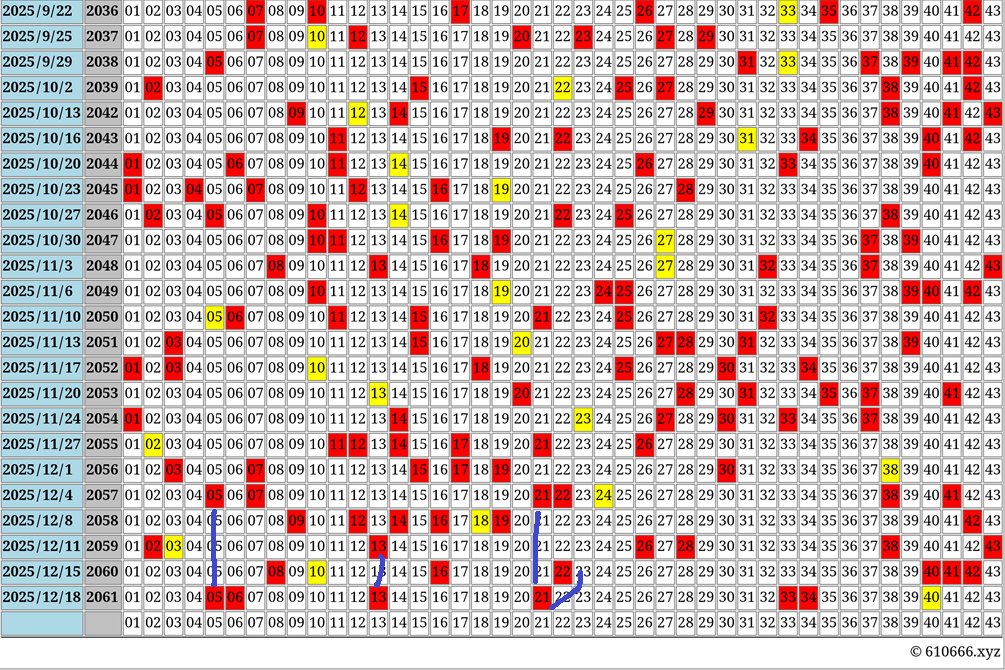 下から四番目の行(48行目)の配置は、赤: 2, 13, 26, 28, 38, 43、黄: 3です。