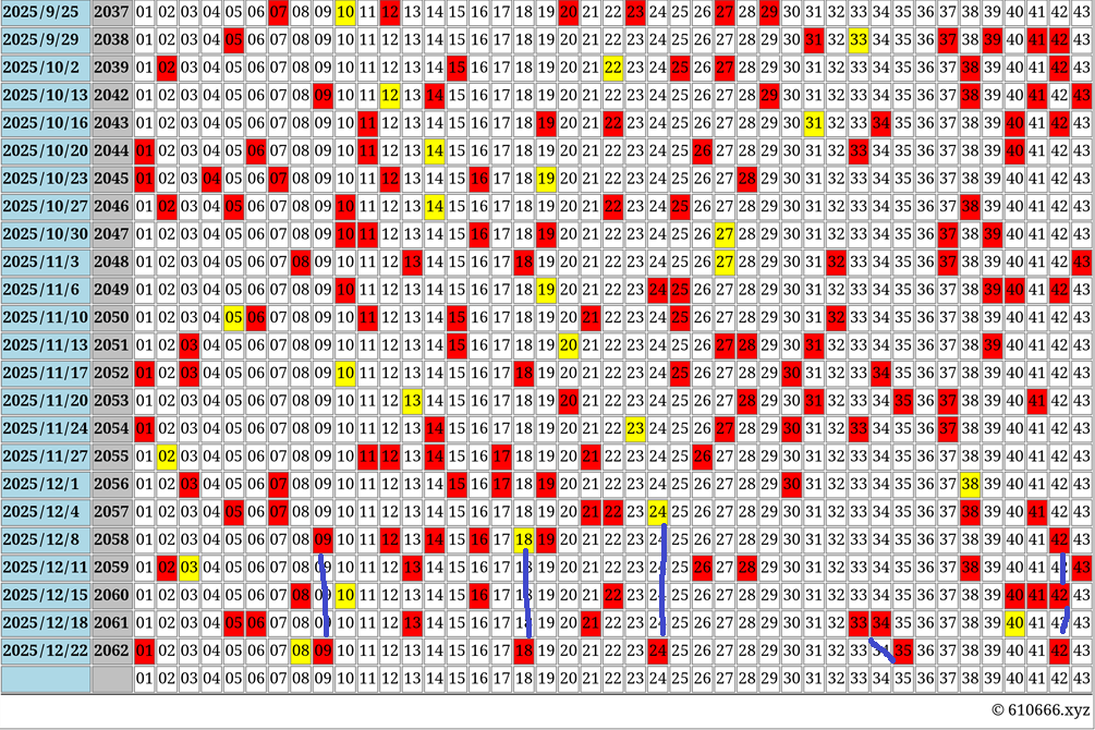 この画像(43列 x 51行)は、日本の宝くじ「ロト6(LOTO6)」の過去の出目表(チャート)です。以下のルールと情報に基づき、最下行(51行目)の配置を推測してください。