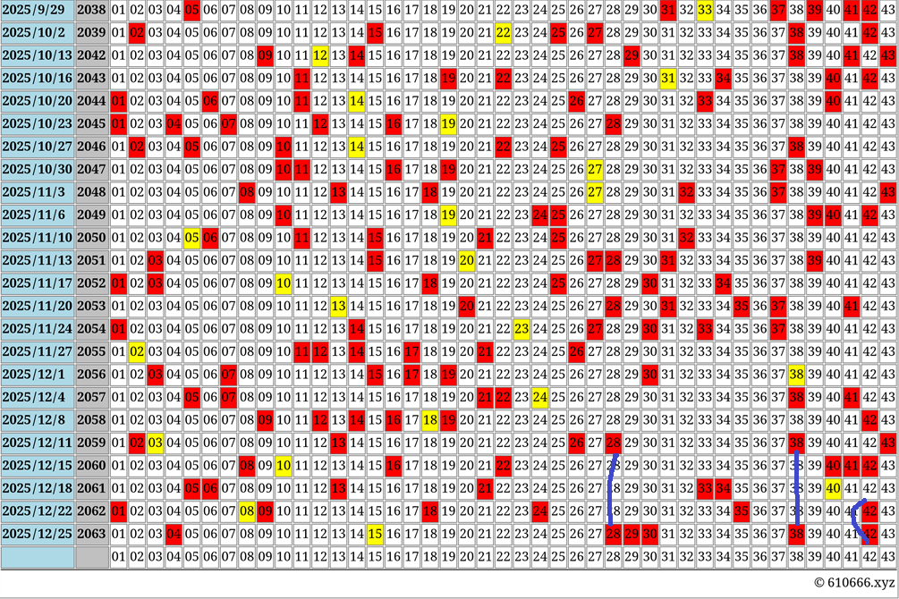 下から六番目の行(46行目)の配置は、赤: 2, 13, 26, 28, 38, 43、黄: 3です。