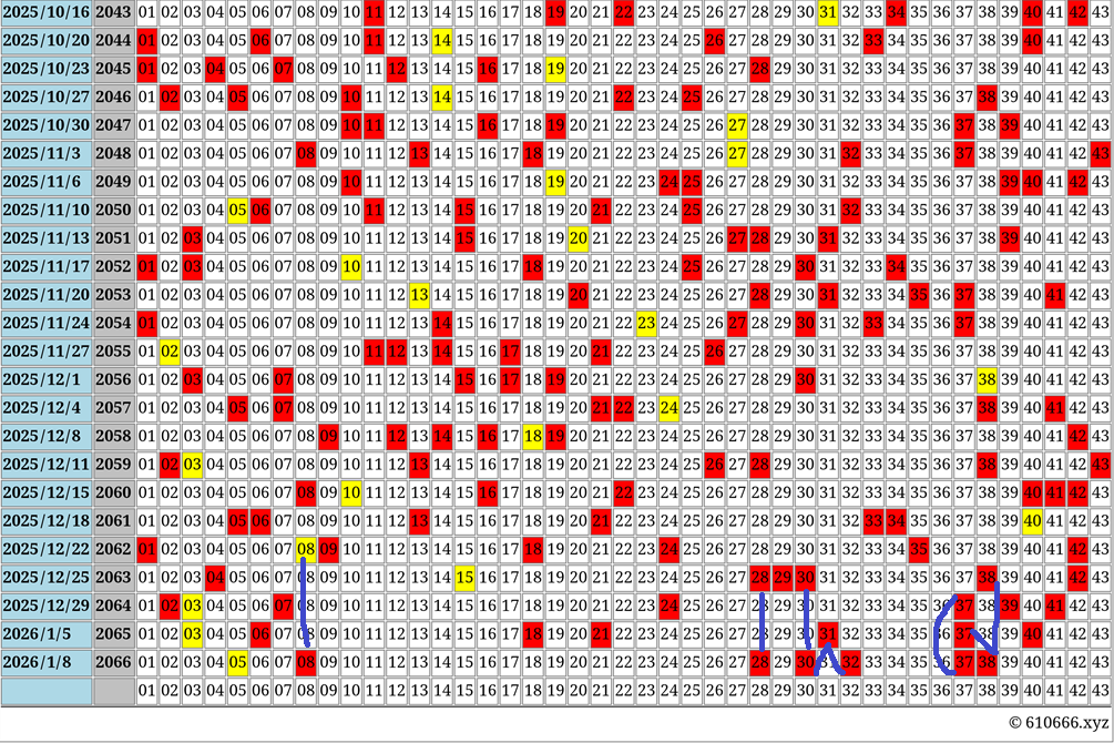 この画像(43列 x 51行)は、日本の宝くじ「ロト6(LOTO6)」の過去の出目表(チャート)です。以下のルールと情報に基づき、最下行(51行目)の配置を推測してください。
