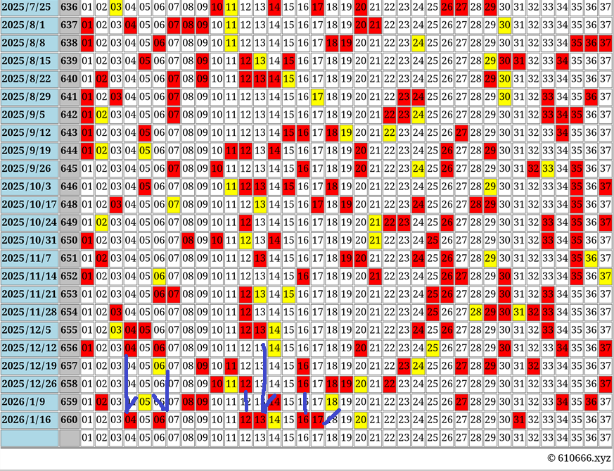 下から六番目の行(46行目)の配置は、赤: 1, 4, 6, 20, 30, 34, 37、黄: 14, 25です。