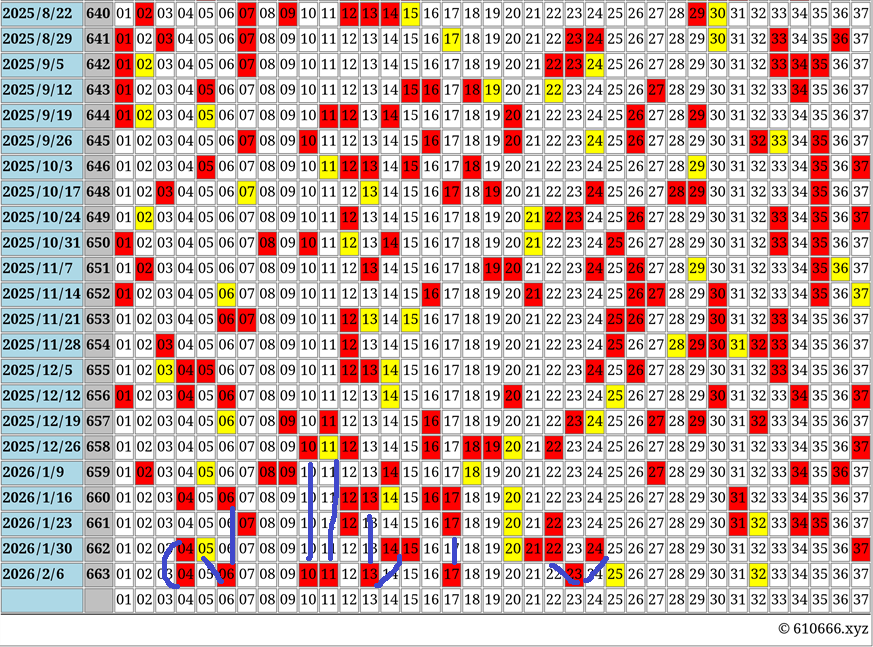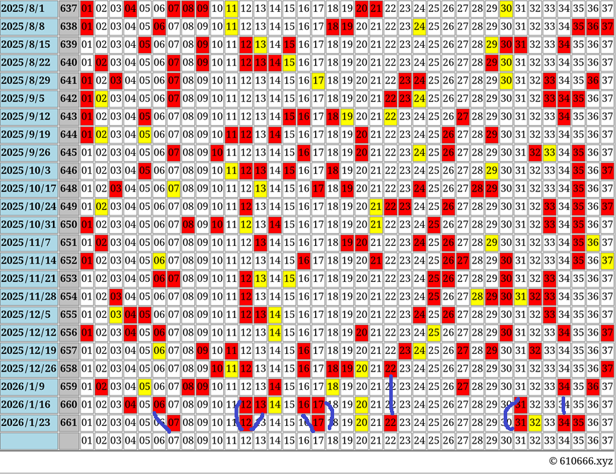 この出目表は、画像生成AIに読み込ませることを目的として作りましたが、色々な要素が選択できますので、従来の出目表形式(抽籤日・抽籤回:あり、セル内の数字:あり)に設定して、スクリーンショットをダウンロードすることもできます。